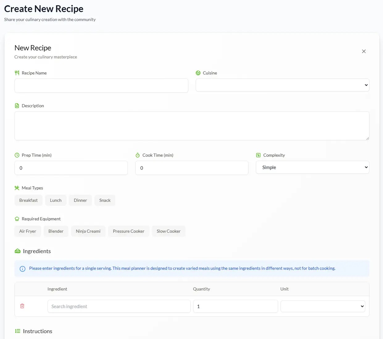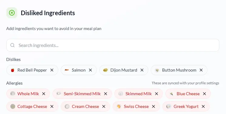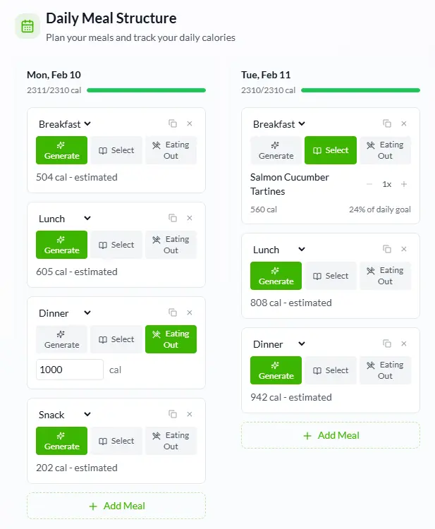Choose calories, diet style, meals per day, allergies, dislikes, and the amount of structure you want.