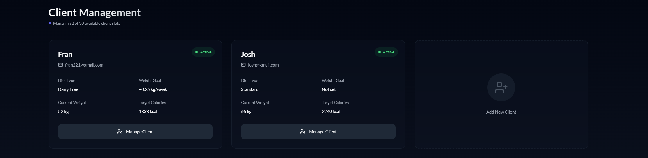 Create personalised meal plans while tracking preferences, allergies, and progress for each client.