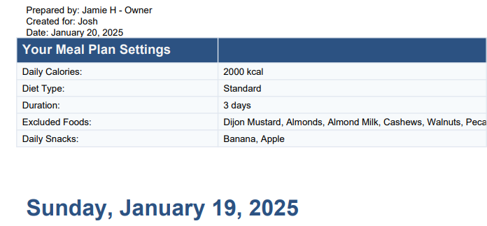 Generate branded meal plans and shopping lists that reflect your professional identity.